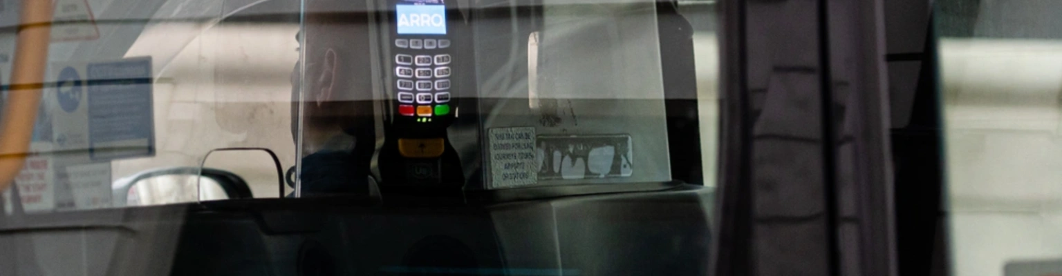 - When you reach your destination, you’ll find a card machine in the back of the cab.